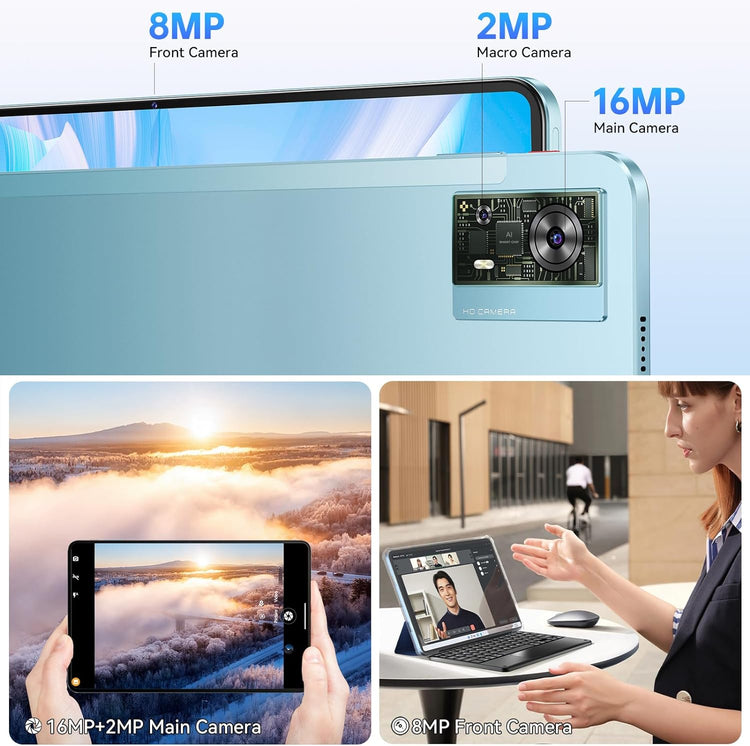 - [High-Resolution Cameras]Capture life's moments with precision using the tablet's advanced camera setup. The 16MP rear camera, ensures clear and sharp landscapes, portraits, and other subjects, making each frame truly admirable. For selfies and video calls, rely on the 8MP front camera to present your best image during communications with friends and family. Additionally, the 2MP macro camera captures life's intricate details with stunning clarity, enhancing your photography experience