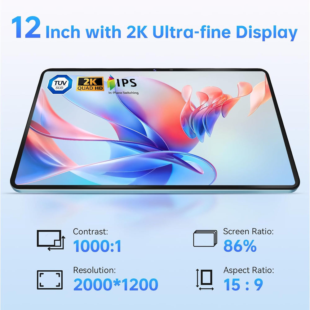 - [12-Inch 2K Tablet, TÜV Certification] Our remarkable tablet provides a generous 12-inch screen, immersing you in a breathtaking visual world with an impressive 2K resolution of 2000*1200. Despite its large screen, it maintains an ultra-slim profile at just 7.5mm, delivering a comfortable user experience. Additionally, With TUV blue light certification and eye protection mode, extended viewing won't harm your eyes, ensuring peace of mind