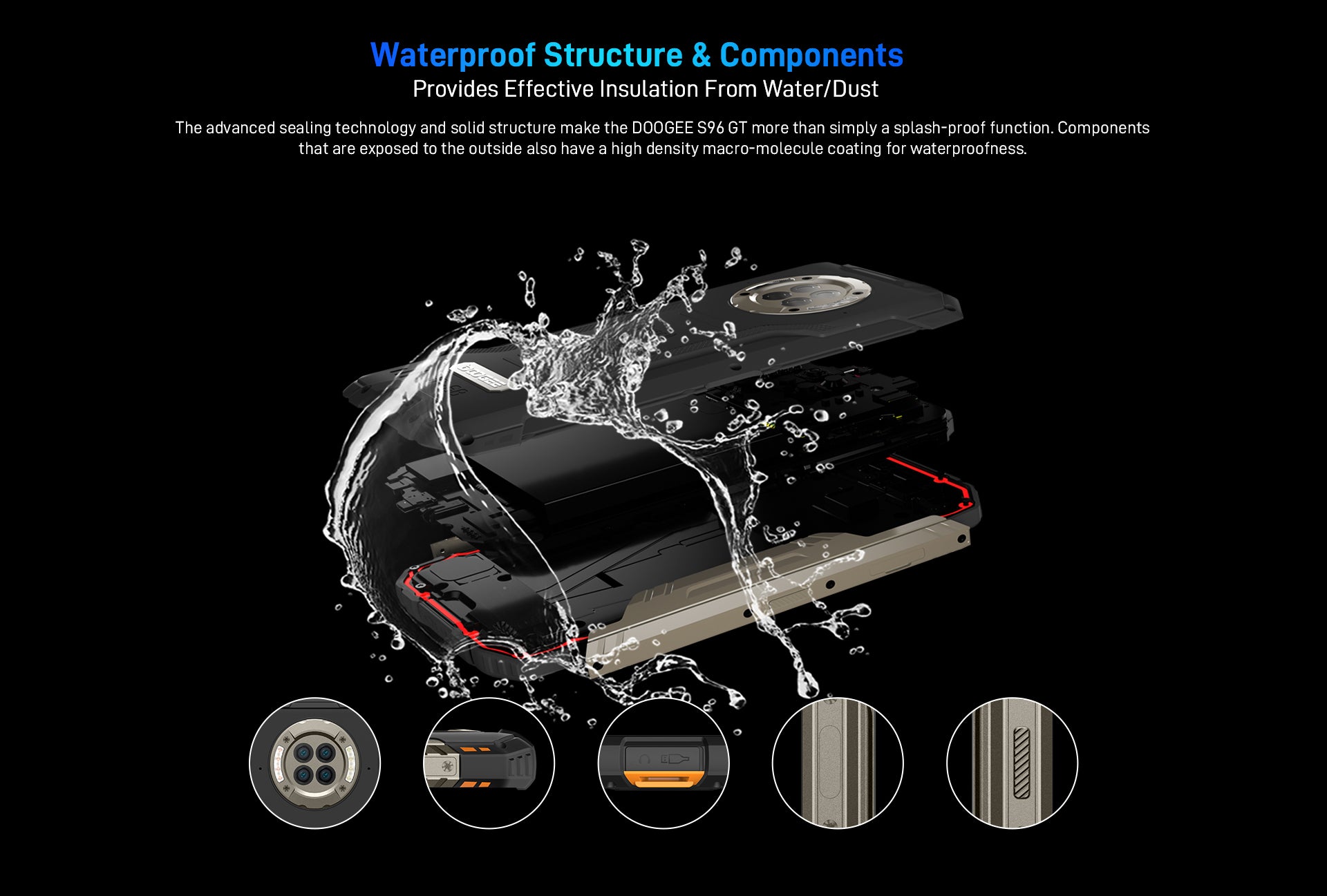 The advanced sealing technology and solid structure make the DOOGEE S96 GT more than simply a splash-proof function.