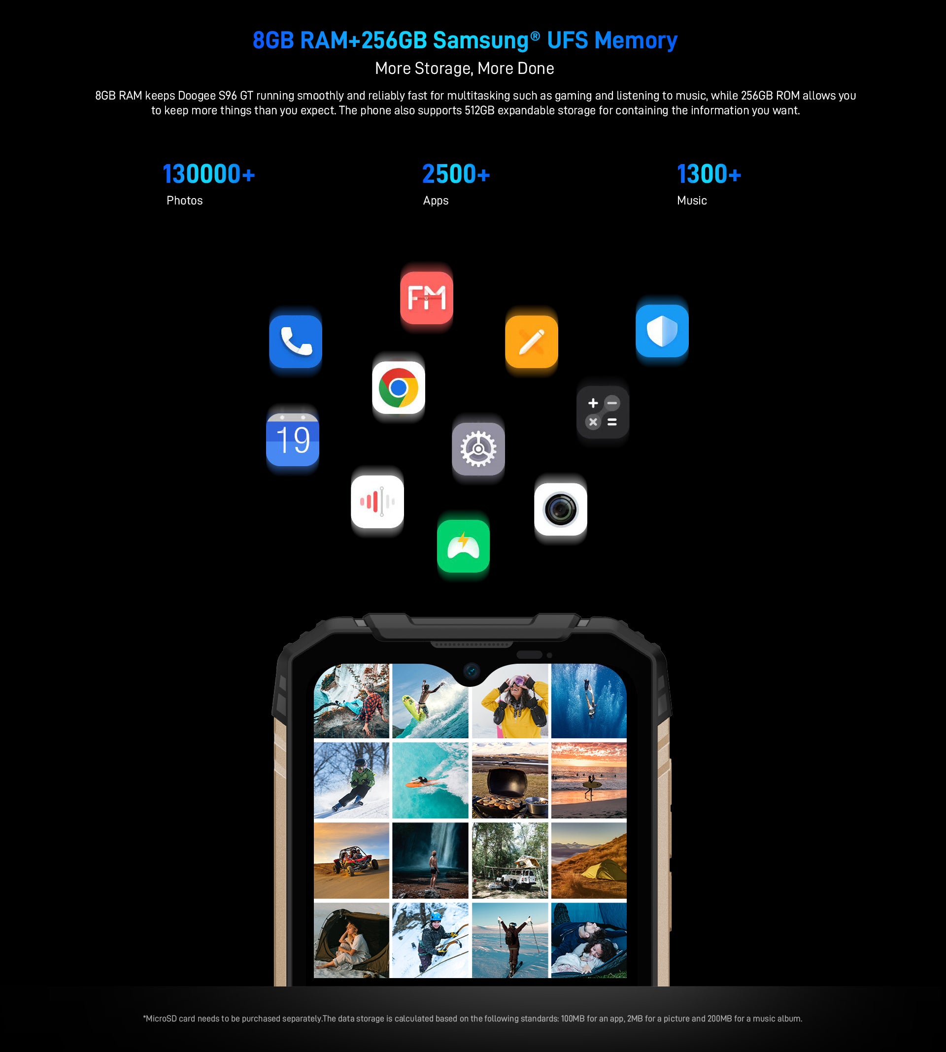 8GB RAM keeps Doogee S96 GT running smoothly and reliably fast for multitasking such as gaming and listening to music,