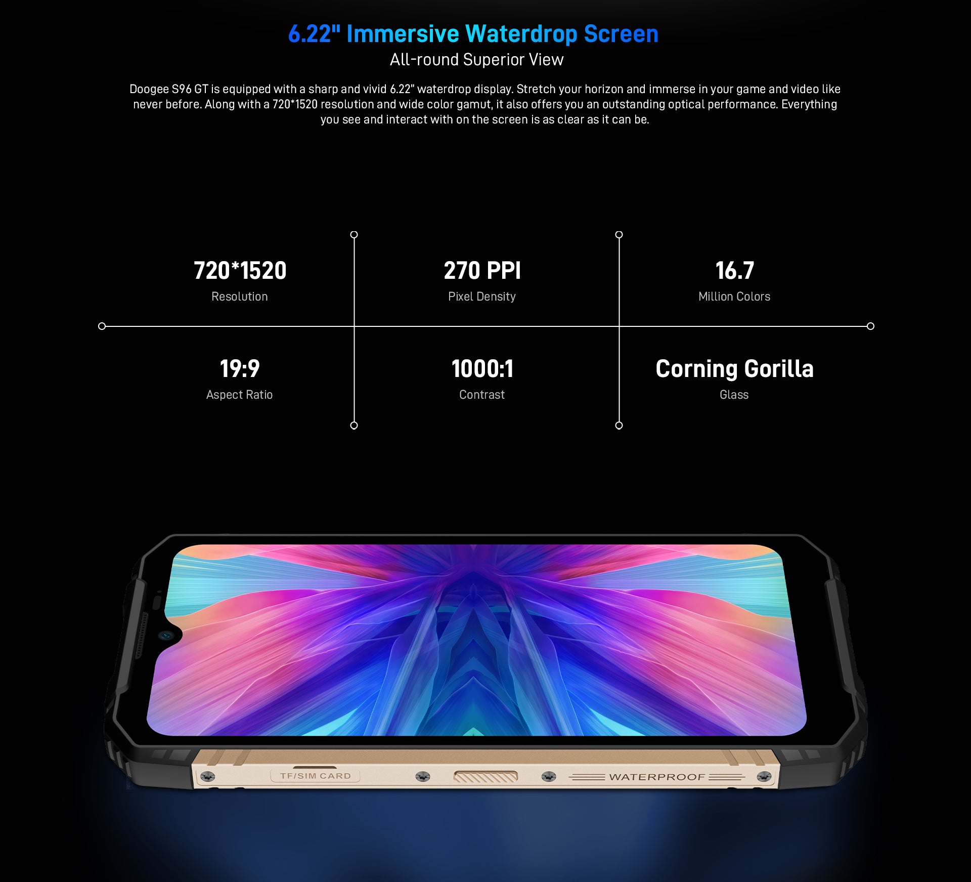 Doogee S96 GT is equipped with a sharp and vivid 6.22” waterdrop display.