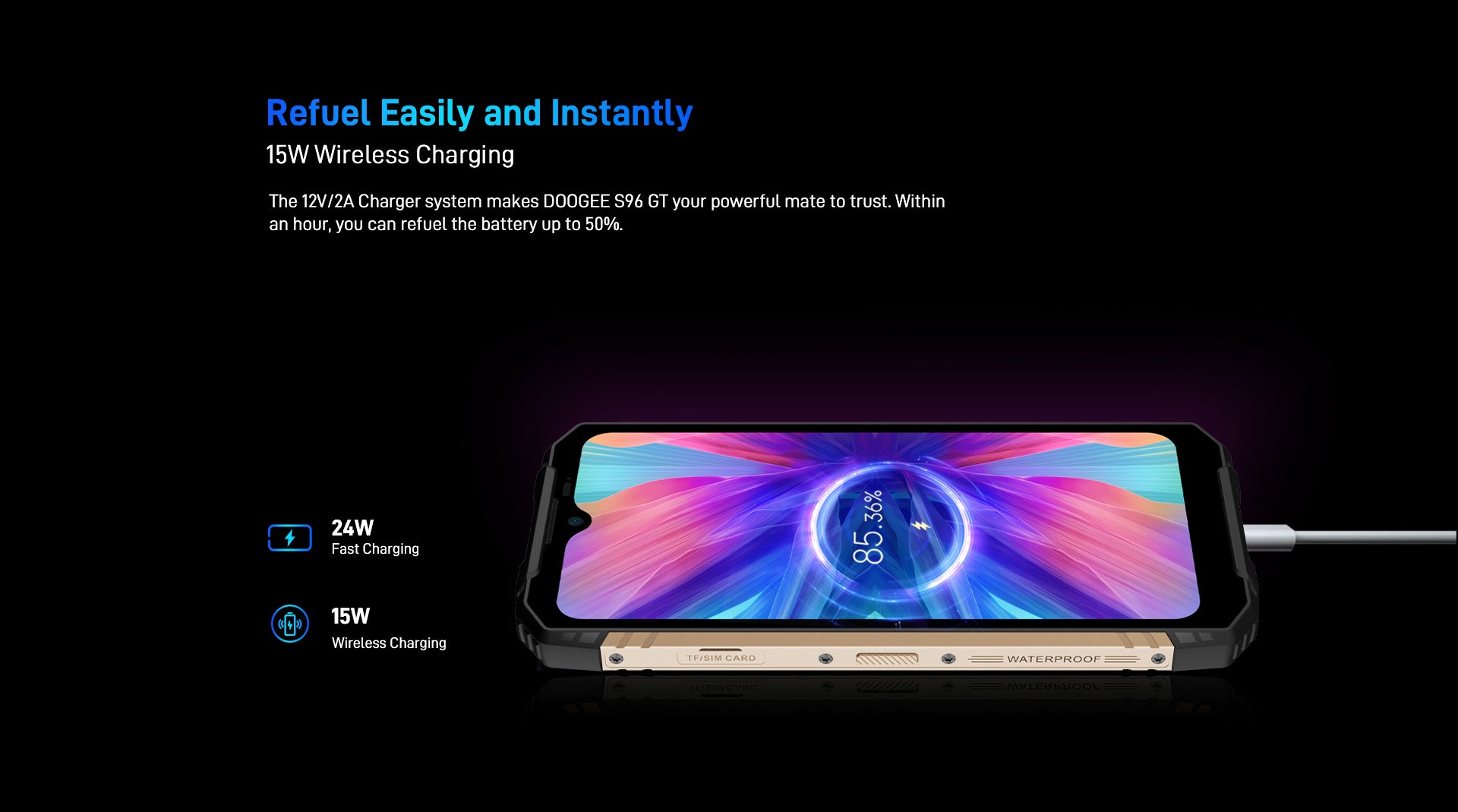 The 12V/2A Charger system makes DOOGEE S96 GT your powerful mate to trust.