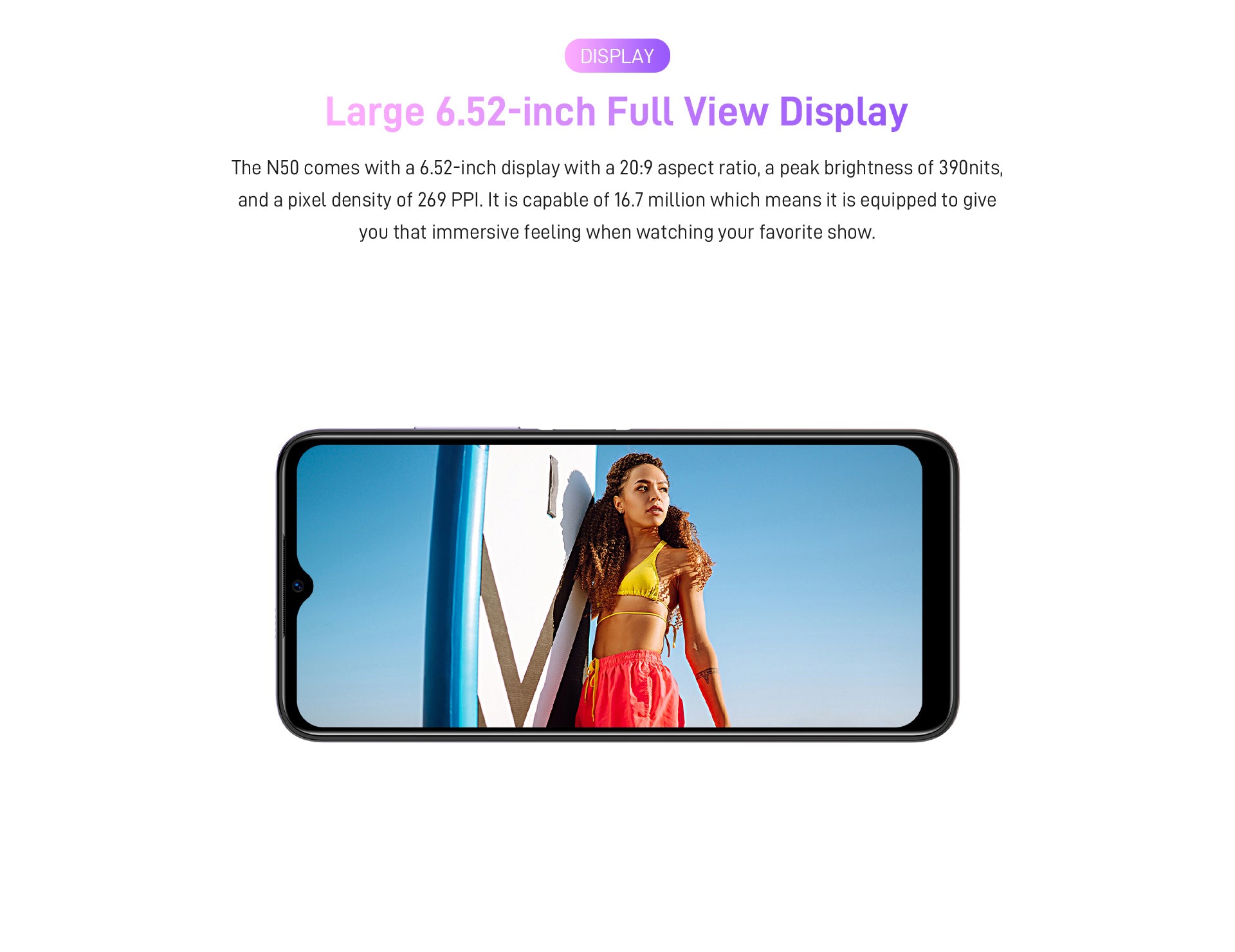 The N50 comes with a 6.52-inch display with a 20:9 aspect ratio, a peak brightness of 390nits, and a pixel density of 269 PPI.