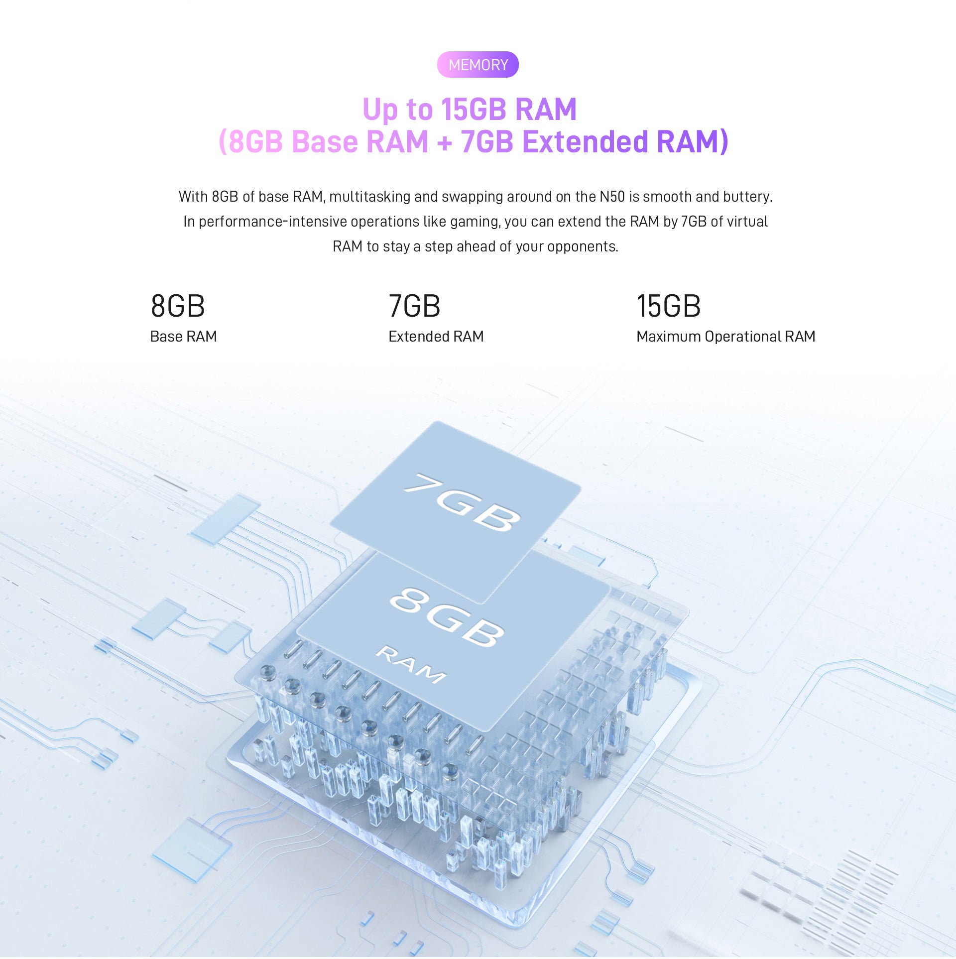 Up to 15GB RAM (8GB Base RAM + 7GB Extended RAM)