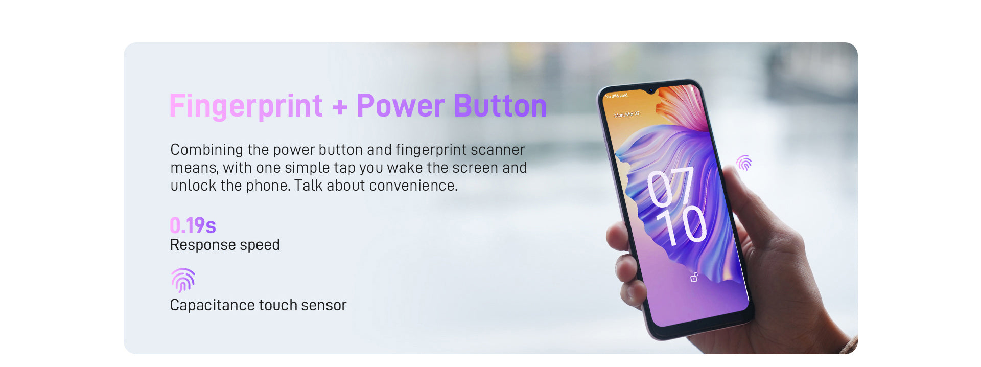 Fingerprint + Power Button Combining the power button and fingerprint scanner means, with one simple tap you wake the screen and unlock the phone. Talk about convenience. - 0.19s - Response speed - Capacitance touch sensor |
