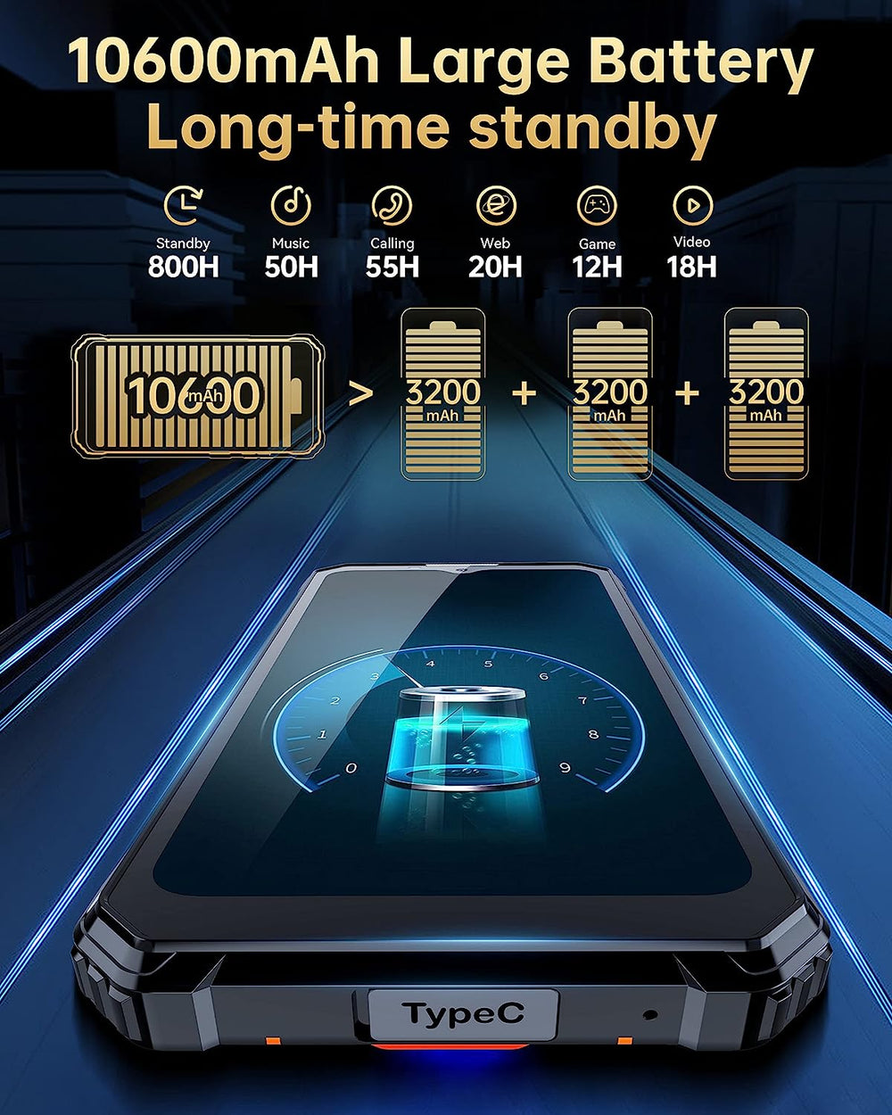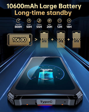 - [10600mAh Large Capacity Battery, Long-lasting Standby] The OUKITEL WP23 rugged smartphone 10600mAh battery with a smart management system in smartphone can not only provide long lasting battery life, it is more than 2 times the capacity of ordinary smartphones, so that you can use your mobile phone for a long time without worrying about power consumption. After all, it can also monitor and manage the use of batteries to ensure the life and performance of the battery, and to prevent problems such as overcharge, over -loading, and overcurrent.