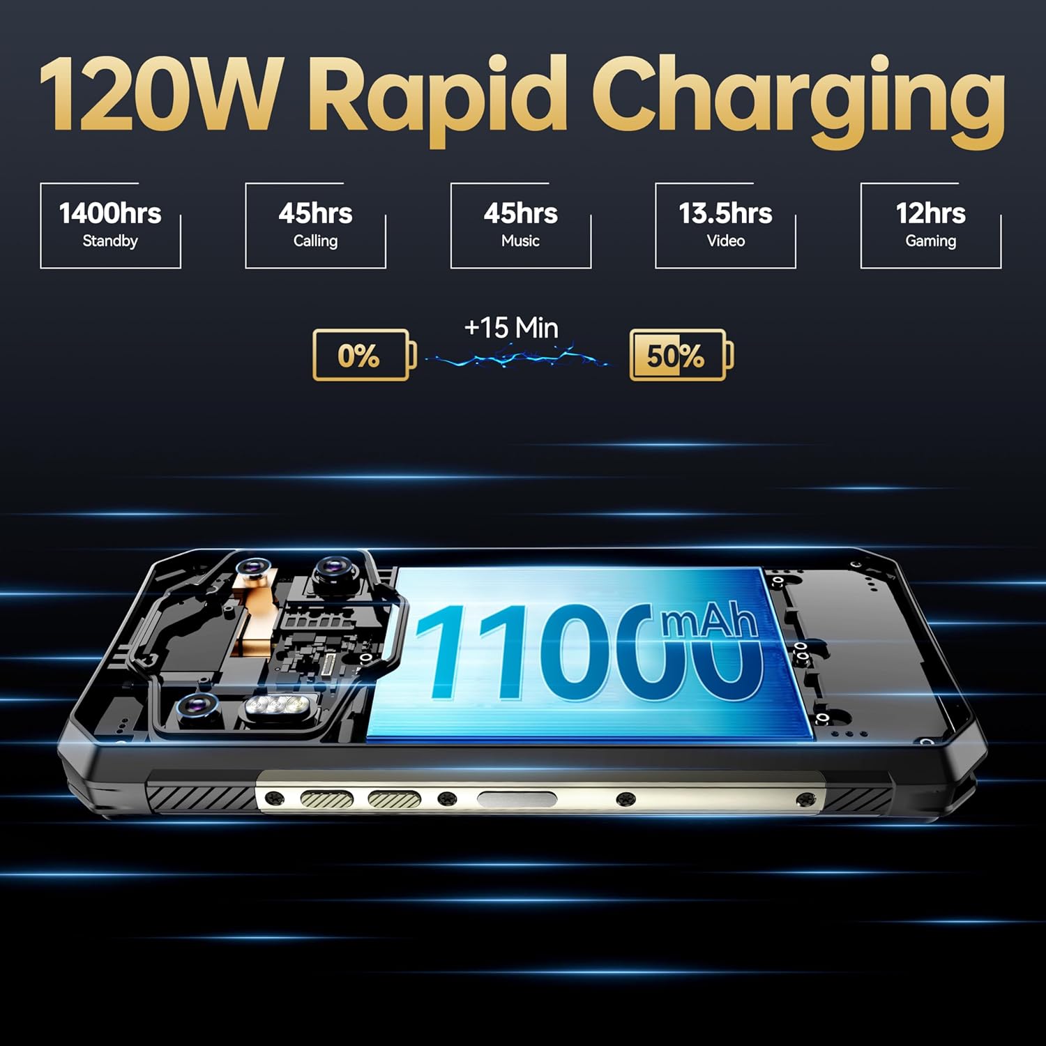 - [120W Extremely Fast Charging & 11000mAh Battery] OUKITEL WP30 Pro rugged mobile phone supports 120W extremely fast charging. It can charge 50% of the power in 15 minutes and fully charge in 45 minutes. It can easily solve the problem of running out of power outdoors. Equipped with a large 11000mAh battery, you can enjoy up to 1400 Hours of standby time ensure that your device is always available, supporting 60 hours of calls, 10 hours of music, and 13.50 hours of video