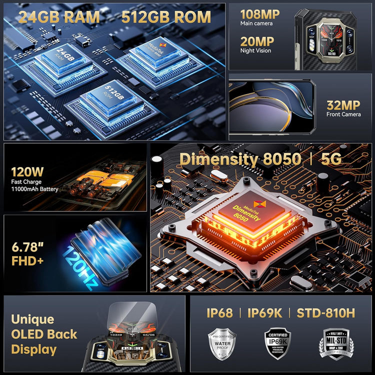 - [MediaTek Dimensity 8050 & 24GB+512GB] 3.0 GHz high-frequency 5G rugged smartphone powered by the Dimensity 8050 octa-core processor. With UFS 3.1 technology boasting lightning-fast read and write speeds of up to 1200MB/s, and a highly efficient 6nm manufacturing process to avoid delays, crashes, or overheating. Equipped with a massive 24GB of RAM (12GB physical + 12GB virtual RAM) and a capacious 512GB of storage, allowing multiple memory-hungry apps to run simultaneously and providing ample storage space