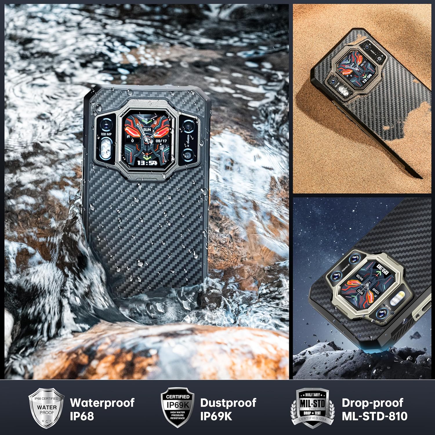 - [Corning Gorilla Glass 5 & 360° Comprehensive Protection] This military grade cell phone is equipped with tough Corning Gorilla Glass 5, providing protection against drops and impacts during daily use. It has passed IP68, IP69K, and MIL-STD-810H tests, ensuring excellent water, dust, sand, moisture, dirt, and salt spray resistance. It can survive drops from 1.5 meters and is waterproof up to 1.5 meters for 30 minutes, providing reliable protection even in the harshest outdoor conditions