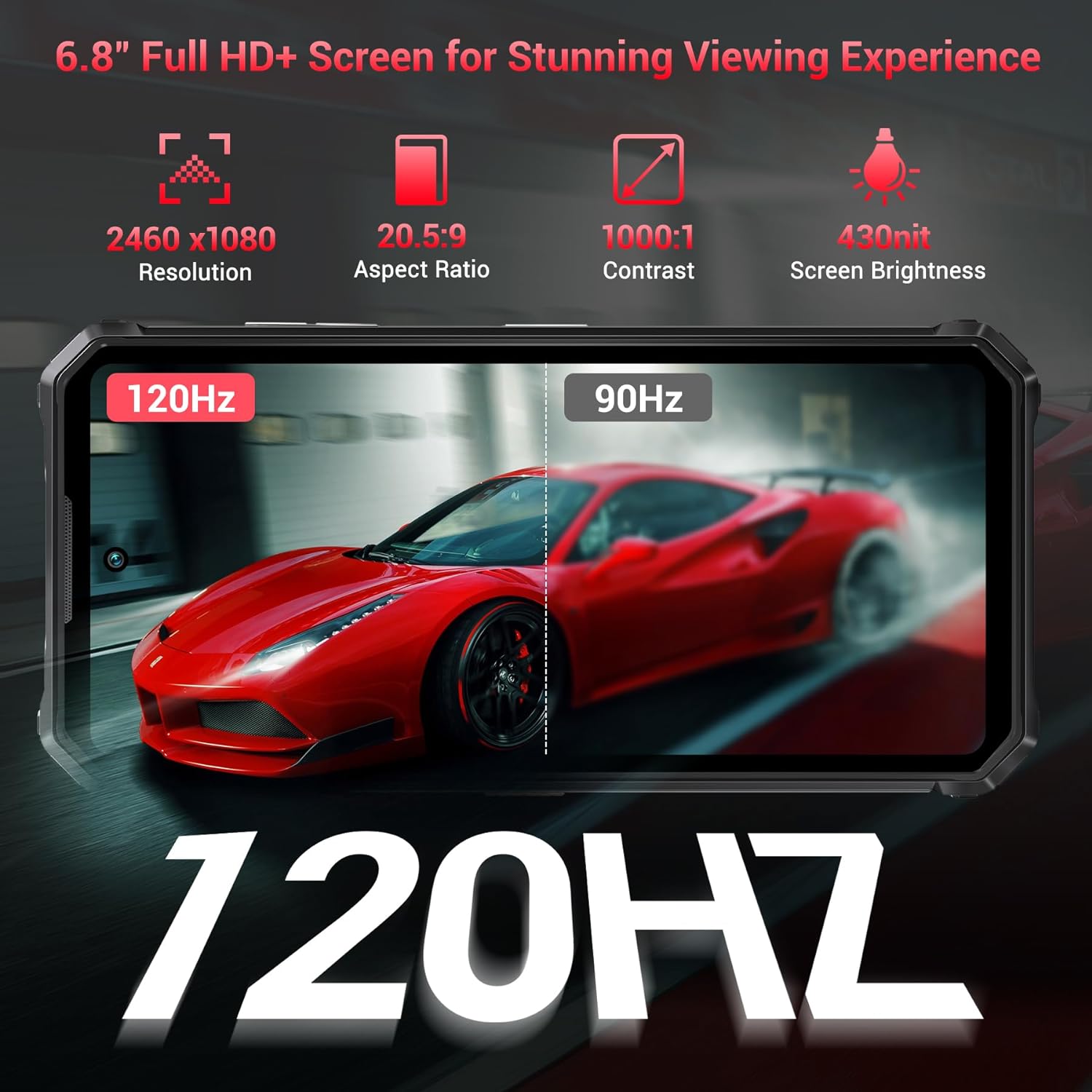 - 📲【 6.8"FHD+ Screen & 120Hz Refresh Rate】The OUKITEL WP19 PRO unlocked cell phone features a 6.8-inch FHD+ display, intelligent 120Hz refresh rate & 2460*1080 high resolution, providing clear and silky smooth images while watching videos or playing games, providing a supremely smooth daily using experience. The tough phone offers you splendid and comfortable vision experience and sensitive screen touch.