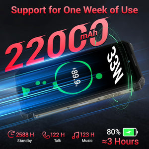 - 🔋【22000mAh Battery & 33W Fast Charging】OUKITEL WP19 PRO rugged smartphone unlocked equipped with 22000mAh battery, which will provide more durable usage time. The OUKITEL WP19 Pro mobile phone features 33W fast charging capability, allowing you to refuel your device to 80% charge in just 3 hours, whether it's playing games or watching videos, you don't worry about the rugged phone running out of battery. Use the OTG cable (not included) to charge other tablets or smart devices.
