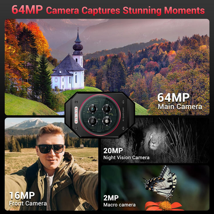- 📷【64MP Main Camera & 20MP Night Vision】OUKITEL WP19 PRO outdoor smartphone with a 64MP main camera, you can capture images with remarkable clarity and detail; the 16MP front-facing camera supports beauty selfies, which makes you can enjoy beauty at any time; the OUKITEL WP19 PRO rugged phones unlocked with 20MP night vision camera will bring the enchantment of low-light photography to life. Additionally, the 2MP macro camera allows you to capture very subtle objects such as flowers and so on