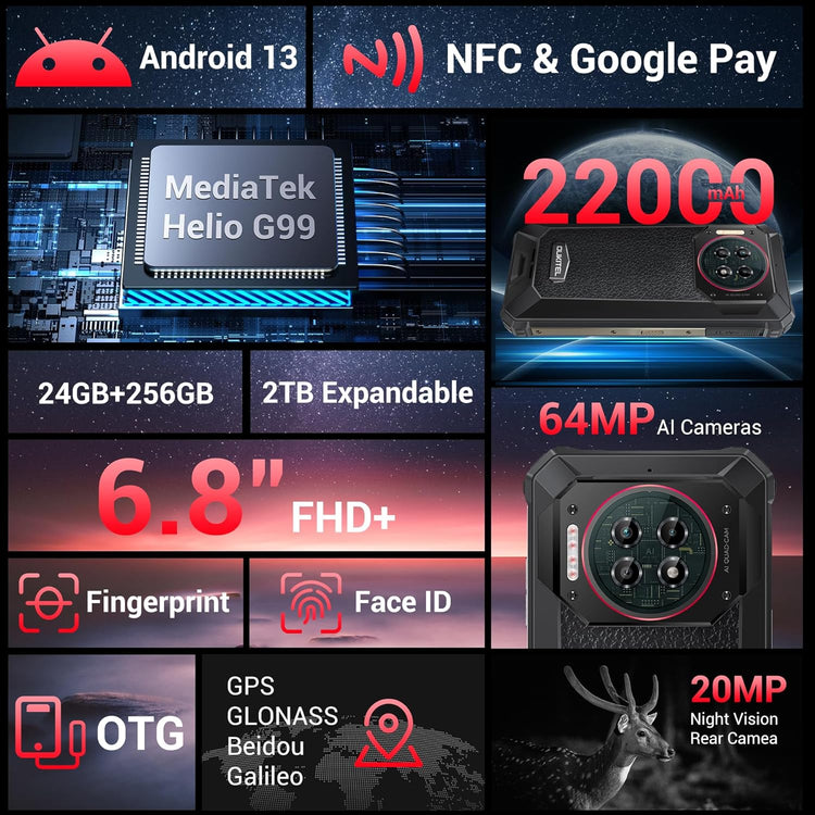 - 🌟【24GB+256GB Octa-Core Phone】OUKITEL WP19 pro phone is equipped with Helio G99 Octa-Core processor and the latest Android 13 system will provide brilliant operating experience for you. 24GB RAM( 8GB RAM+16GB virtual RAM) can handle multiple tasks at the same time, enabling faster app switching without any delay. With 256GB ROM, you can store more photos and other files without worrying about insufficient space. Even if you are a gaming or photography enthusiast, OUKITEL WP19 PRO cell phone is still a good choice
